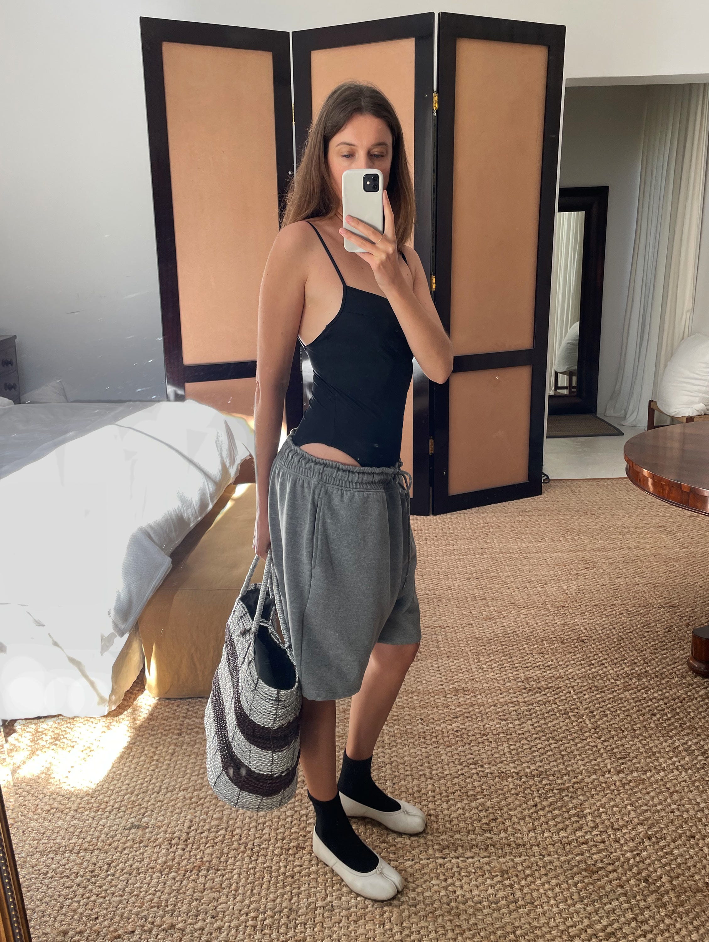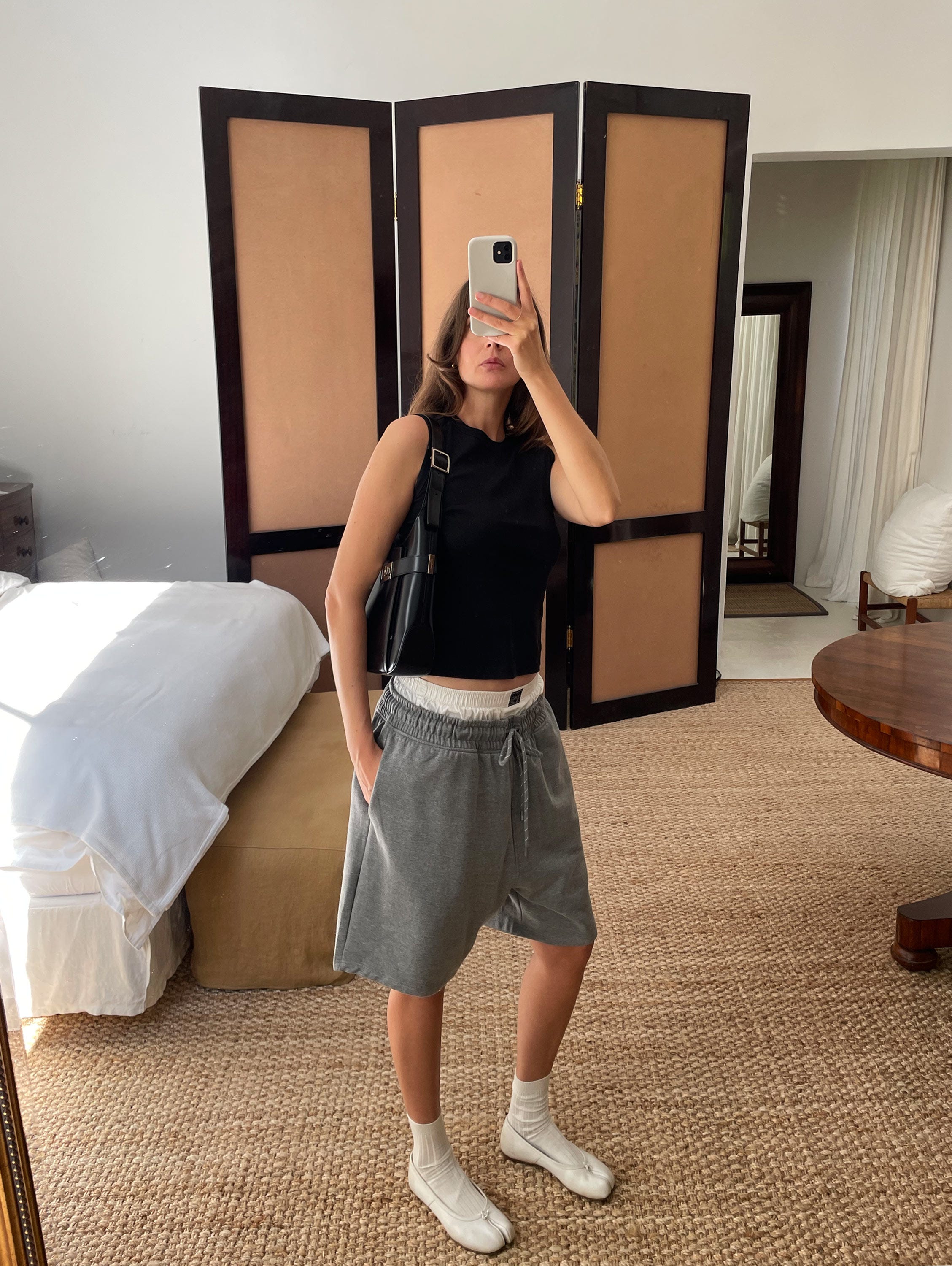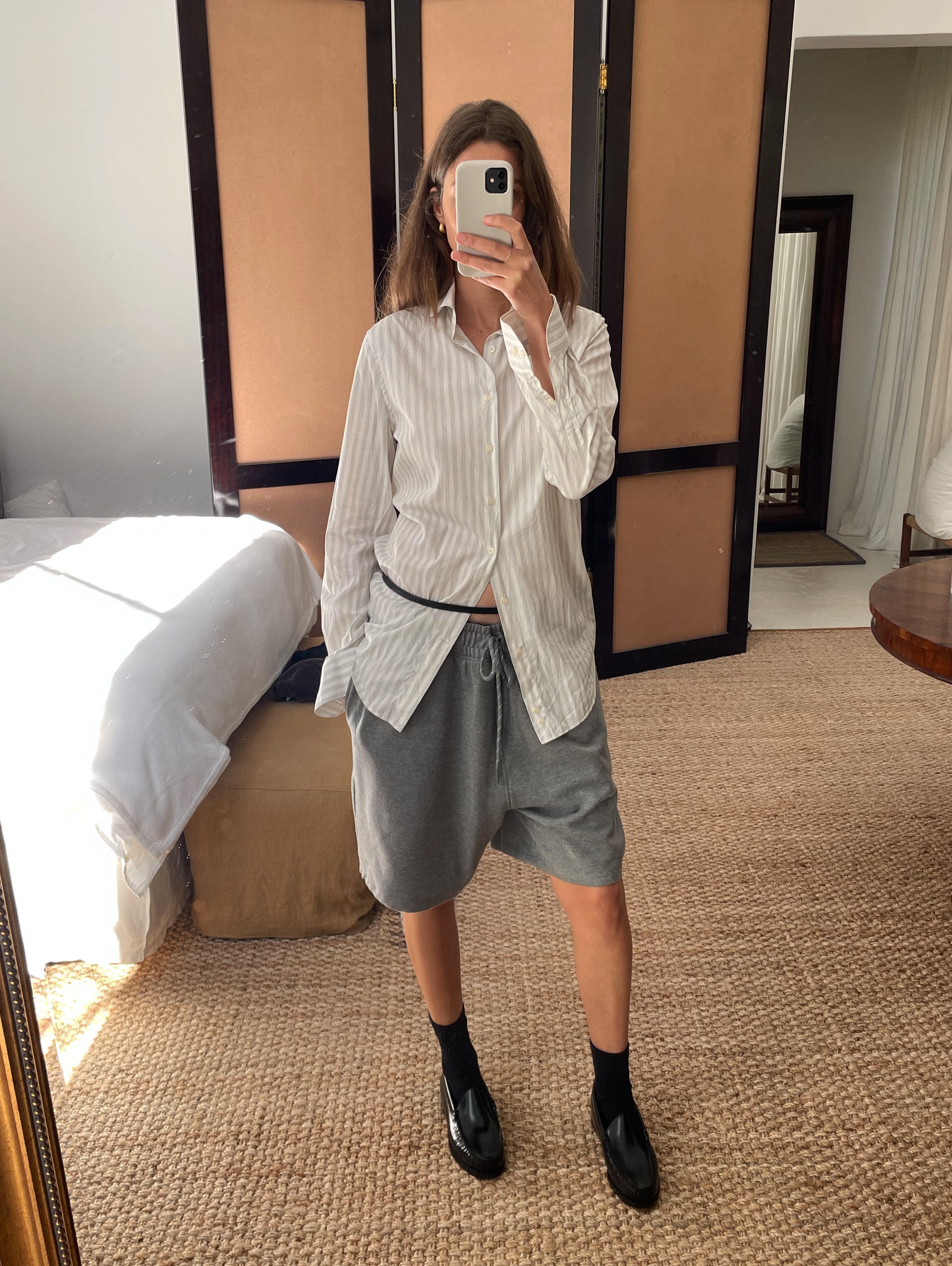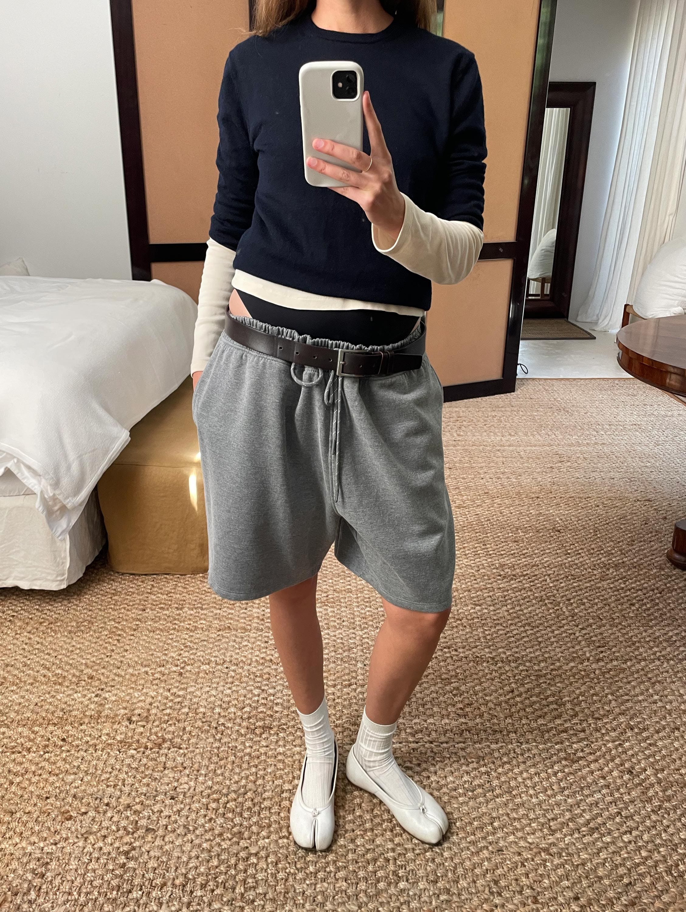 Even with a slightly worn-out wardrobe, I continue to discover new vibrancy in men’s fashion. As you might expect from me by now, I raided this all-American classic gray sweatshort from my man’s wardrobe and have been wearing it on repeat. The sweat ensemble (sweatshirt and sweatshort), introduced in the early 20th century as utilitarian garments for male athletes, has evolved into a personal favorite staple for reasons far beyond mere comfort and practicality. The sweatshort, in this case, delivers that necessary clash in an outfit. It whispers, “I'm chic, but wait, I'm n(h)ot.” It perfectly encapsulates the dynamic reality of my life (and that of many others). It’s a stylish yet practical statement piece that effortlessly balances elegance and ease.